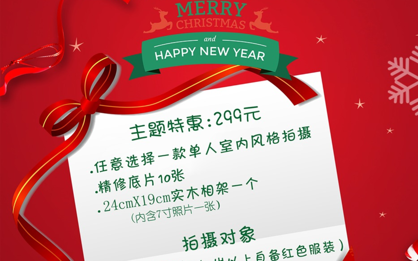 ·此套餐为单人室内新年主题拍摄 ·精修电子底片10张 ·24X19cm相架一个(内含7寸照片一张) ·拍摄截止时间至:1月18日 备注: 1、 一岁以上需自备红色服装 每增加一个孩子加100元,每加一个大人加50元,不含化妆。 2、本活动不与店内其他优惠活动叠加使用。 3、活动价以全额订购预留为准。